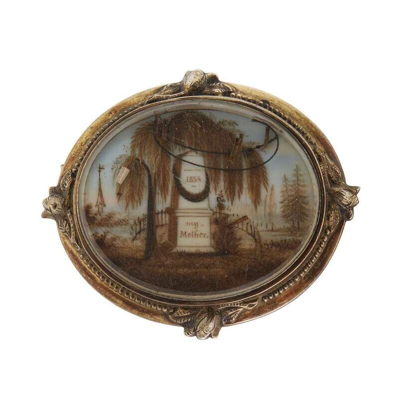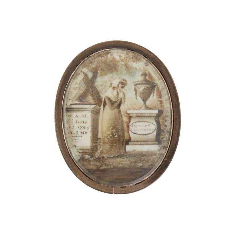 The first, of oval form, painted with woman praying beside covered urn on plinth inscribed, "Departed/ In...," a second plinth inscribed, "W. A. M./ Ob June/ 1795/ AE 2 Mo," the reverse set with hair, once fitted as a pin, now with loop attachment; the second, an oval gold, ivory and hairwork mourning pin depicting swagged obelisk dated, "1855," the below plinth inscribed, "my/ Mother," the reverse fitted with horizontal pin; both seemingly unmarked.