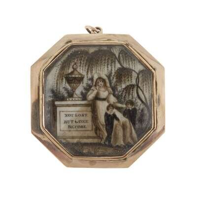 Of octagonal form, painted with woman and two children mourning beside urn on plinth inscribed, "NOT LOST/ BUT GONE/ BEFORE," the reverse set with lock of braided hair, seemingly unmarked.