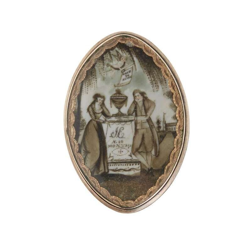 Of oval form, painted with man and woman leaning on plinth topped by covered urn and inscribed, "J.E./ AE. 10/ Months," an angel flies overhead carrying scroll inscribed, "GONE/ TO/ BLISS," church in the background, the reverse set with hair, fitted with pin and loop attachment, seemingly unmarked.