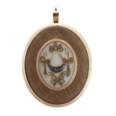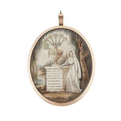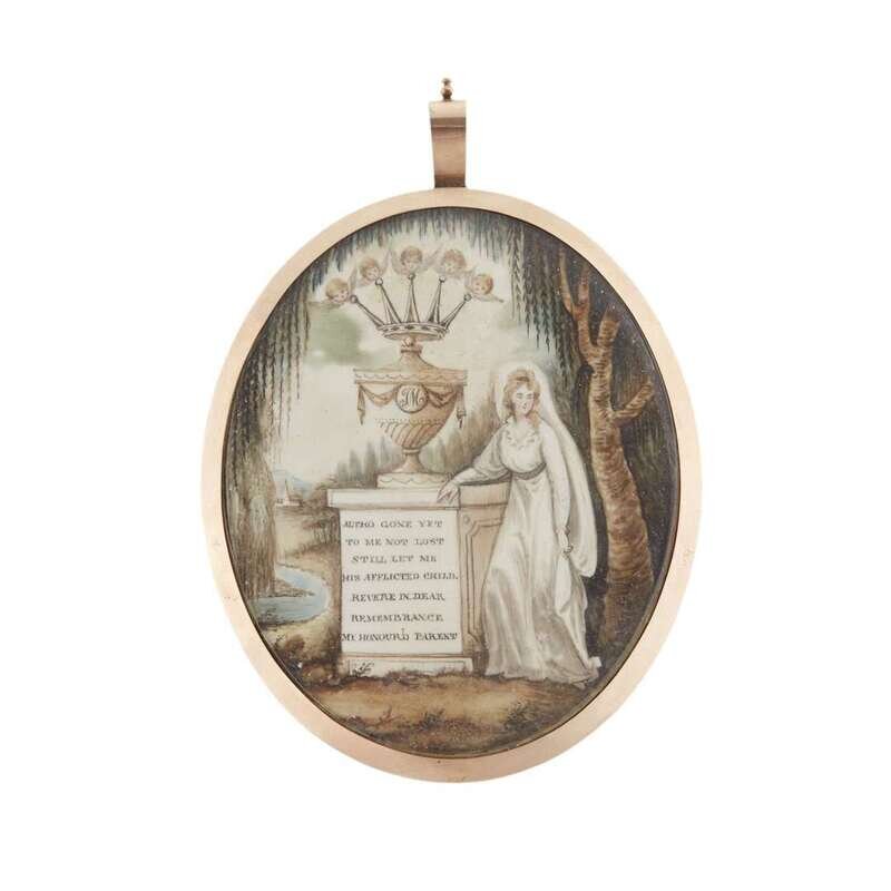 Of oval form, painted with veiled female mourner standing beside covered urn bearing the initials, "JM," above which hovers a crown whose five points are each topped with a cherub's head, the urn raised on a plinth inscribed, "ALTHO GONE YET/ TO ME NOT LOST/ STILL LET ME/ HIS AFFLICTED CHILD./ REVERE IN DEAR/ REMEBRANCE/ MY HONOUR'D PARENT," stream and church beyond; the reverse with iridescent panel adorned with hairwork bows and cobalt swag inscribed with name, partially obscured, "... Mapletoft?," braided hairwork surround, seemingly unmarked.