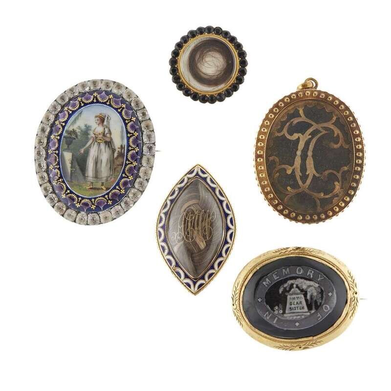 The first, of marquise form, with applied gilt initials, "AMW," on hairwork ground, enamel surround, the reverse set with hair, fitted with pin and loop attachments; the second, of oval form, painted on tin, centering a woman beside urn on plinth, cross on hillock in the distance, conforming paint-decorated surround enclosed by paste brilliants, the reverse fitted with pin; the third, of oval form with gilt initials "JC" against fabric ground, beaded gold surround, the reverse is mother-of-pearl, fitted with pin and loop attachment; the fourth of horizontal oval form, painted enamel showing plinth, inscribed, "IN MEMORY OF/ MY/ DEAR/ SISTER," the reverse fitted with pin, all seemingly unmarked; together with a gold and hairwork mourning pin, with onyx surround, the reverse inscribed, "RG/ Aged 36/ died 16th April/ 1828."