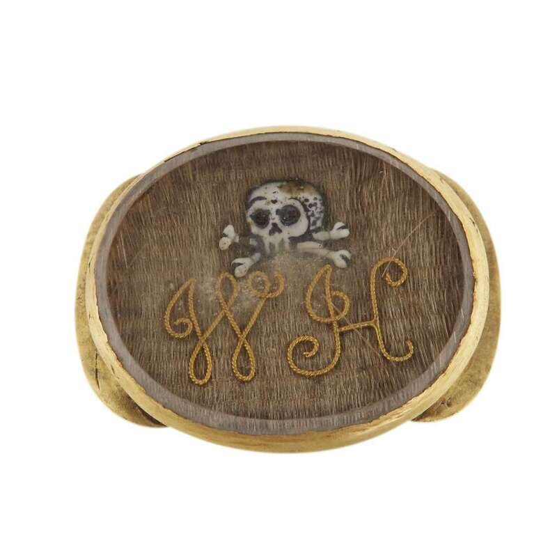 Of oval form, with enameled skull and crossbones above gold wire initials, "WH," all against hairwork ground and under faceted rock crystal, the reverse with loop attachments, seemingly unmarked.