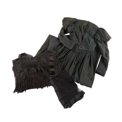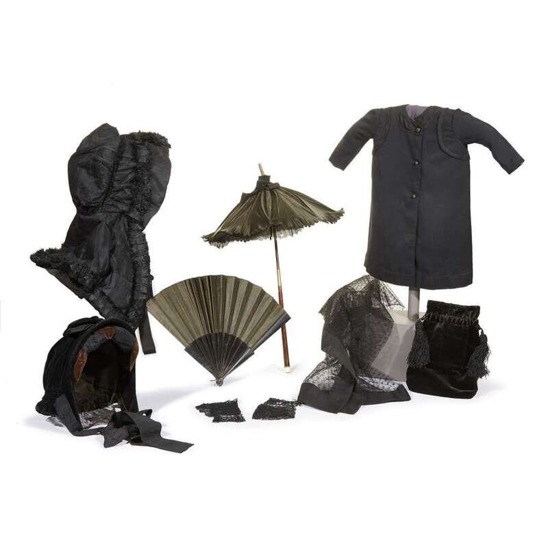 Including a fan, velvet reticule, folding parasol, two bonnets, a small child's coat, black lace mitts, two net veils and a chiffon veil, mantle and a ladies dress.