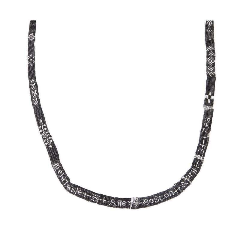Comprised of black and white beads, arranged to read, "Mehitable H. Riley Boston April 13 1793" and "JHR SJHR MRLR + EPR PADHR JR"