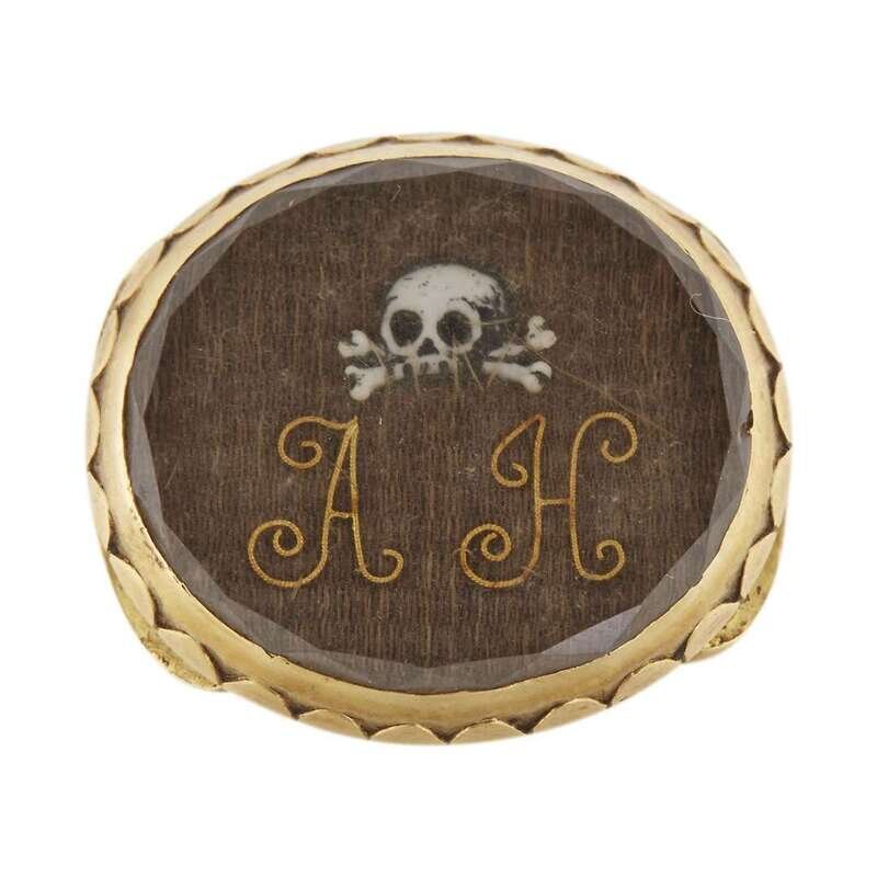 Of oval form, with enameled skull and crossbones above gold wire initials, "AH," all against hairwork ground and under faceted rock crystal, the reverse with loop attachments, seemingly unmarked.