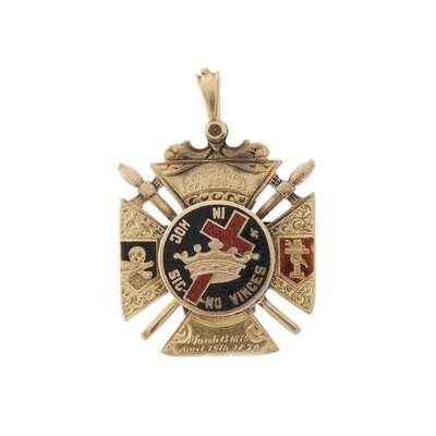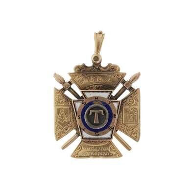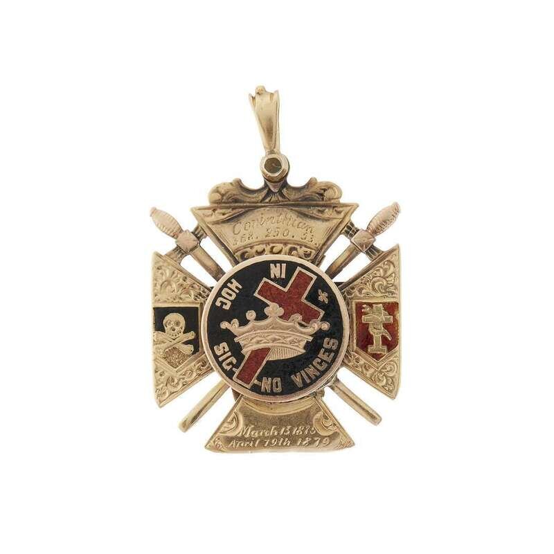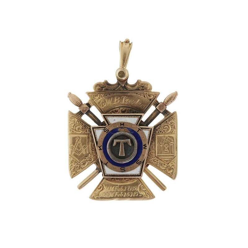 The first side inscribed, "Corinthian/ 368. 250. 53." above central roundel with enamel cross and crown inscribed, "IN HOC SIC NO VINCES," further inscribed below, "March 14 1875/ April 19th 1879"; the reverse inscribed, "GWB Taylor" and "MM Feb. 17 1874/ RAM Feb 16 1785" and engraved with masonic devices.