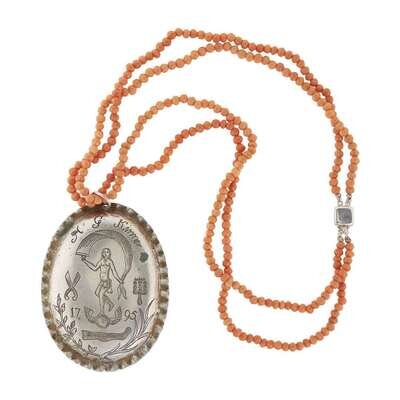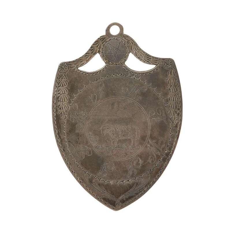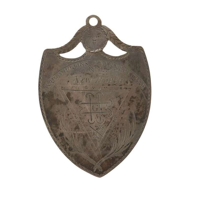 Of shield-shape, the one side engraved, "DARIUS HIGGINS FRANKLIN CHAP./ NO. 2/ NEW HAVEN beneath sun; the other side with central roundel with lamb enclosed by the initials, "H T W S S T K S"; together with an engraved oval silver pendant with crimped edge, dated 1795, depicting figure holding a flowing textile, flanked by shears and a carding comb, inscribed, "H. G. Kinner," suspended from coral beaded strands, both seemingly unmarked.