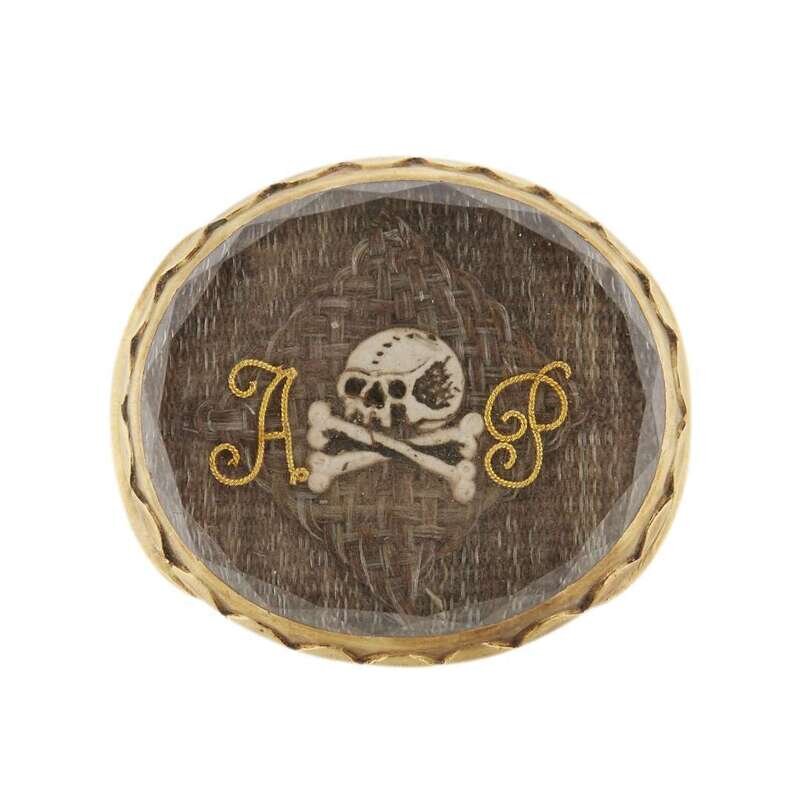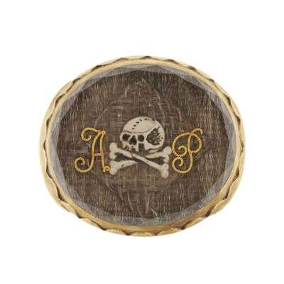 Of oval form, with enameled skull and crossbones flanked by gold wire initials, "AP," all against hairwork ground and under faceted rock crystal, the reverse with loop attachments, seemingly unmarked.