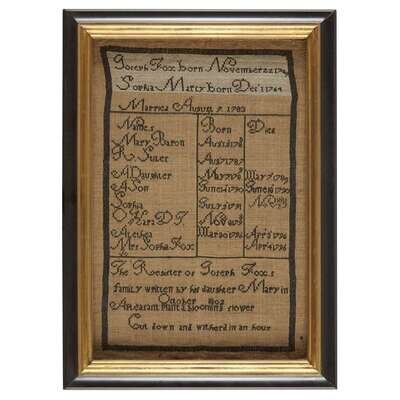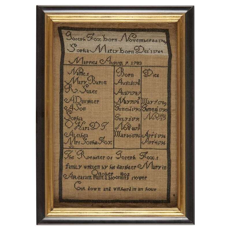 Worked with the inscription, "The Register of Joseph Fox's family written by his daughter Mary in October 1802," silk threads on a linen ground, framed.