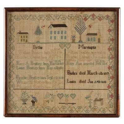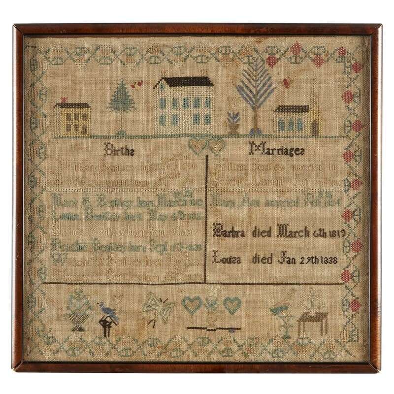 A strawberry border enclosing band with houses and trees, a listing of family births and deaths, and a band of spot devices below, worked in polychrome silk threads on a linen ground, framed.
