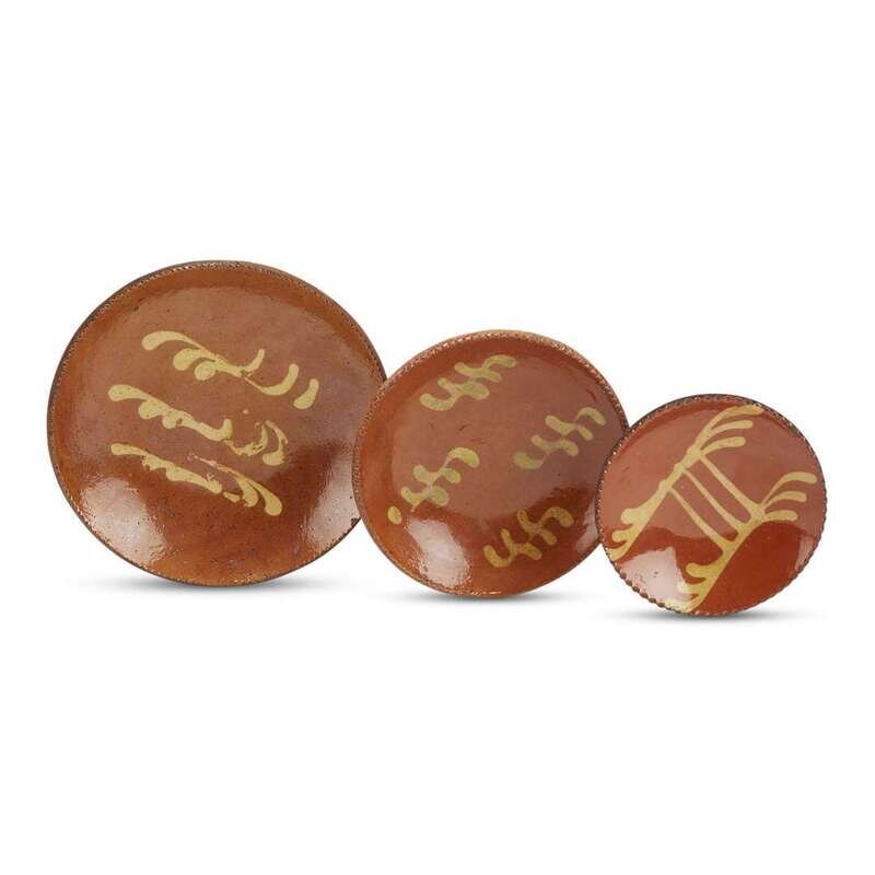 Each plate with yellow slip flourishes and coggled rim, the miniatures with Albany glaze.