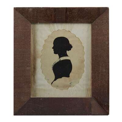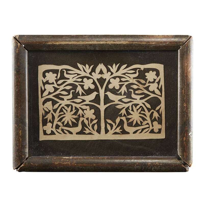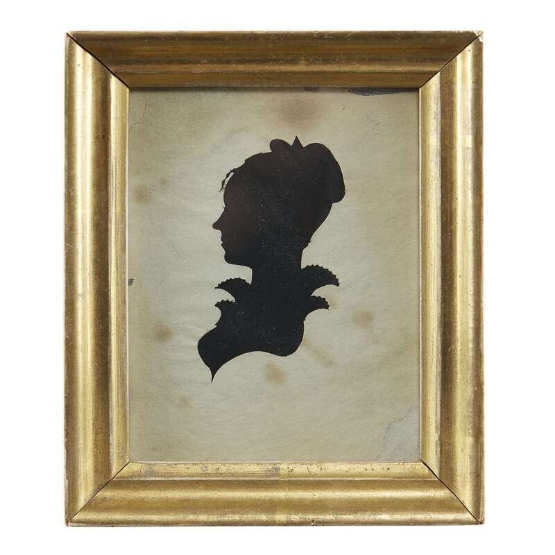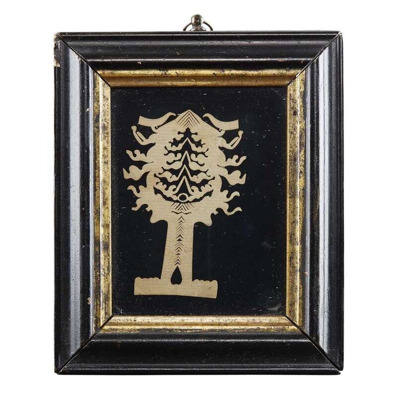 The scherenschnitte, each with a tree with birds; the two hollow-cut silhouettes of young ladies, one heightened with graphite and ink, all framed.