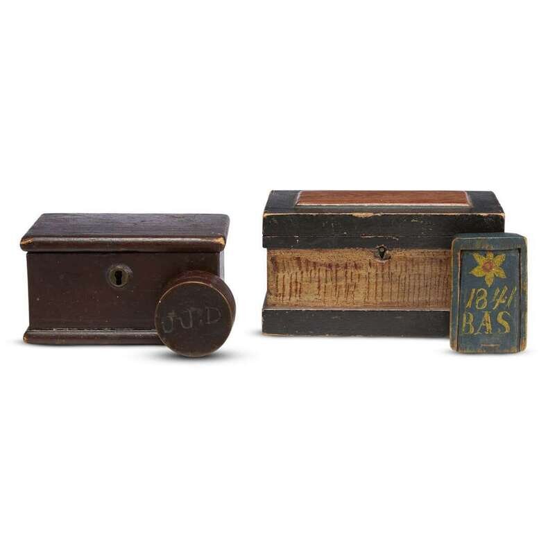 Including a miniature painted and decorated tool box, the underside of lid inscribed in graphite, "Oliver Whitzell," the interior fitted with till above drawers, accompanied by note, "Belonged to Mary Ann Yates, Griggsville, Il. Oliver Whitzell was uncle"; together with a small painted box, a small green-painted box decorated with yellow and orange flowerhead, the date "1841" and the initials "BAS," and a small brown painted box incised "JJD" with drawing of horses to interior.