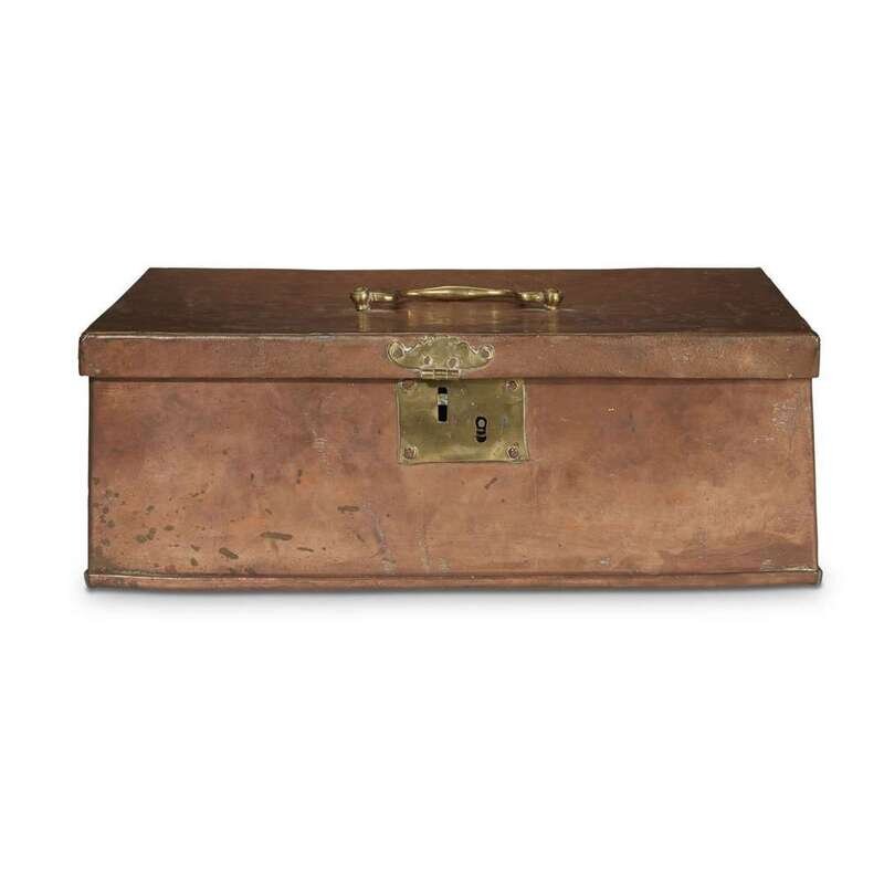 Copper and brass money box made for Ebenezer Clough (1767-1848) of Boston, Massachusetts Made by Coppersmith Nathan Alley, Boston, MA, circa 1820