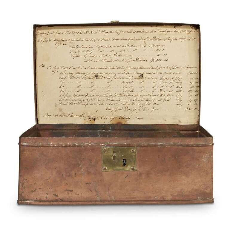Ledger sheet hand-written by Ebenezer Clough affixed to underside of lid with detailed accounting of $415 deposited in box in 1820. The lengthy inscription begins "Boston Jan. 1st 1820. This day I got Mr. Nathn Alley the Coppersmith to make me this trunk give him $0.25 for it...Very good doings for this year May I do as well in the next."