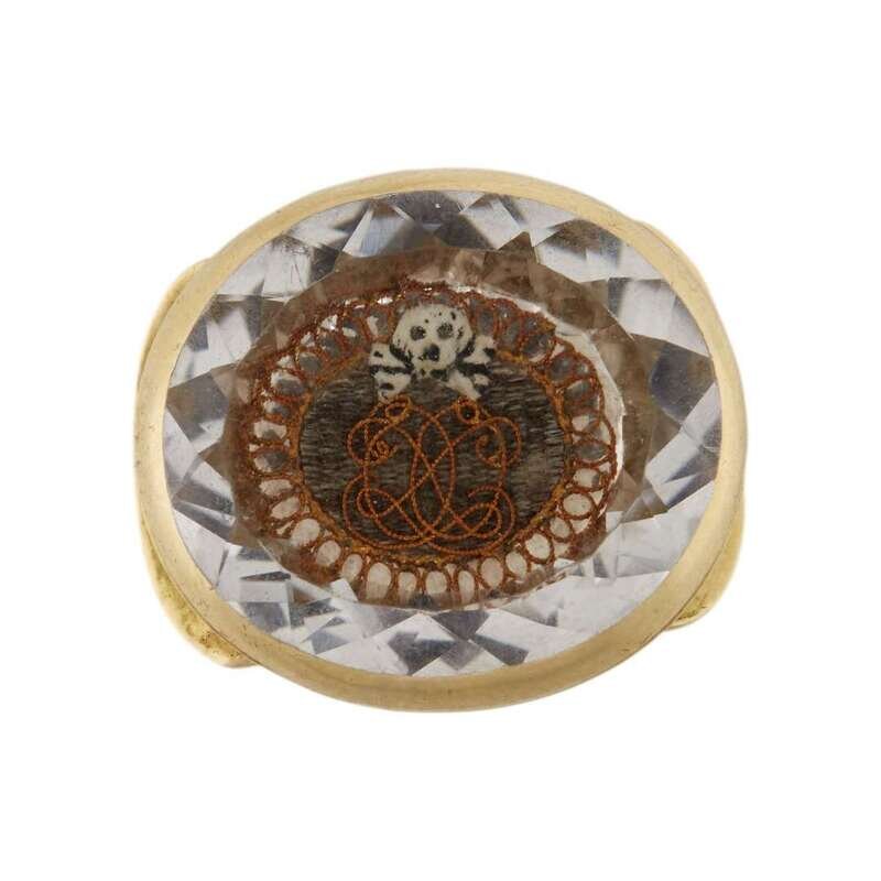 Of oval form, with applied skull and crossbones over gold wire cipher, against hairwork ground with looping gold wire border, all under faceted crystal, the reverse with loop attachments, seemingly unmarked.