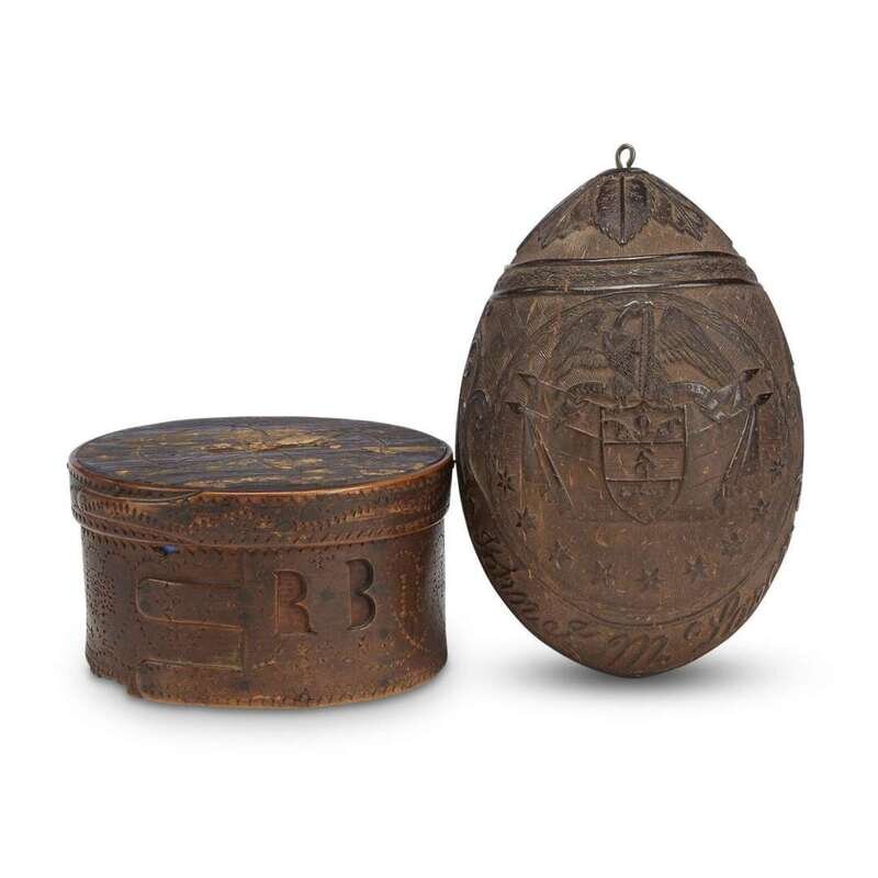 Carved-coconut shell and a chip-carved ditty box Mid 19th century