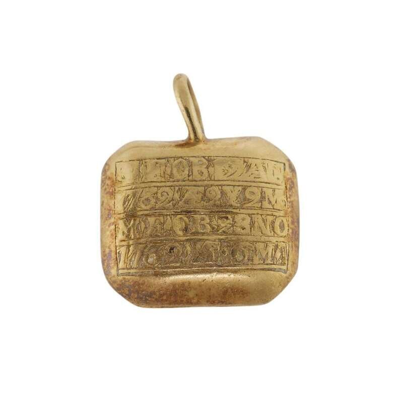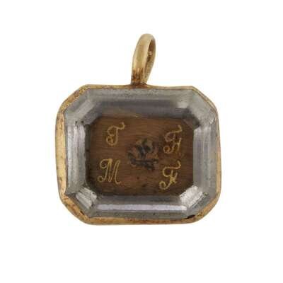 Of canted rectangular form, with stacked gold wire initials "TF" and "MF" flanking applied skull and crossbones, all against hairwork ground and under faceted crystal, the reverse with worn inscription: "TF OB.../ 1732 AE 2Y 2M/ MF OB 28 NO./ 1732 AE 6M...," loop attachment, seemingly unmarked.