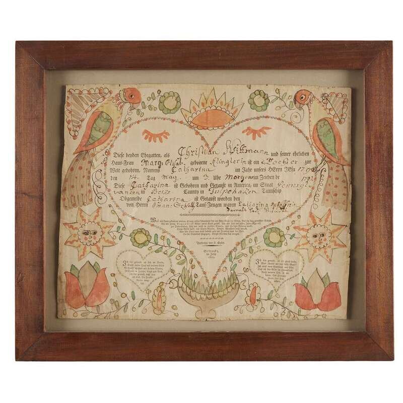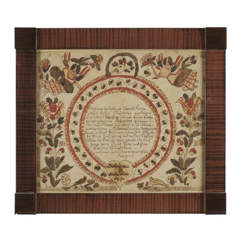 Angel artist The first, printed and hand-colored birth record of Catharine Wittman, Tulpehoken Township, Berks County, born May 14, 1792; and the second, hand-colored and lettered birth record of Johannes Krum, of Heidelberg Township, Northampton County, born March 21, 1802, framed.