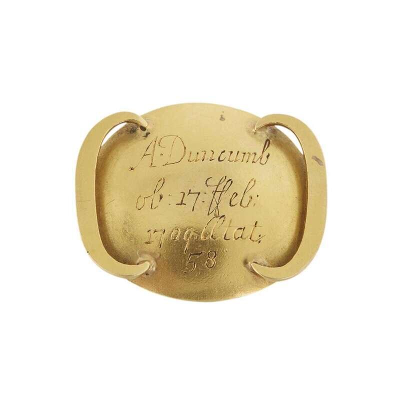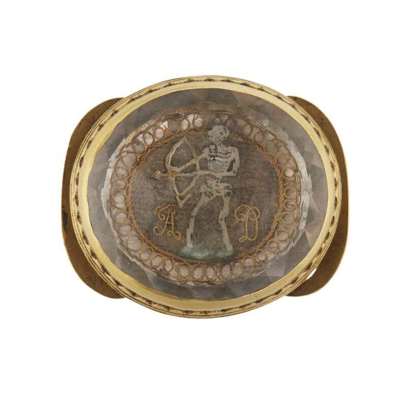Of oval form, with applied skeleton holding bow and arrow flanked by gold wire initials, "AD," against hairwork ground with looping gold wire border, all under faceted crystal, the reverse with loop attachments and inscription, "A. Duncumb/ ob 17 Feb:/ 1709 Atat:/ 58," seemingly unmarked.