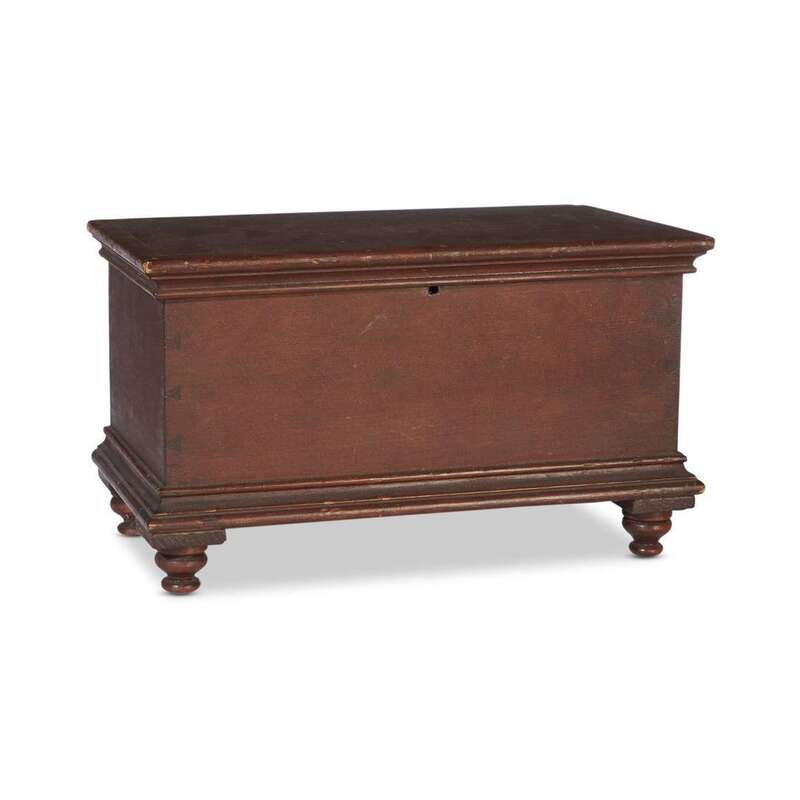 Miniature red-stained box with turned feet Pennsylvania, circa 1830