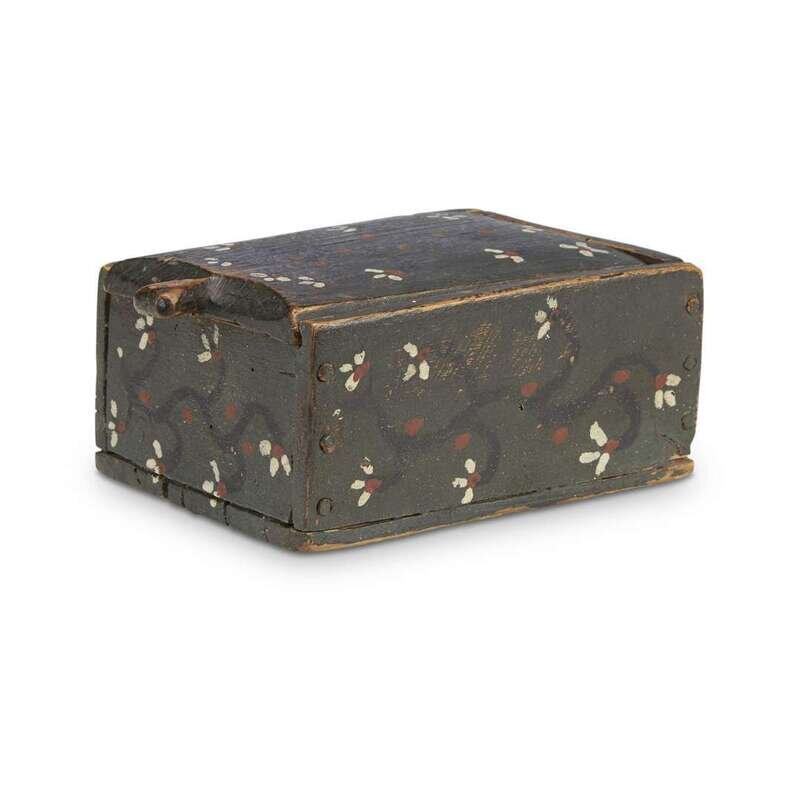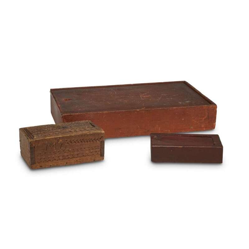 Including a shallow bittersweet-painted candlebox; a small red-painted box with slightly arched top; a small green-painted box decorated with vines with red and white blossoms; and a chip carved box bearing the initials, "M.O" and the date, "1767."