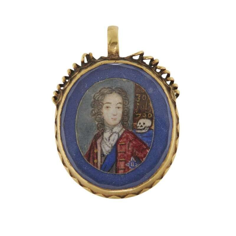 Of oval form, featuring miniature portrait of Prince William, Duke of Gloucester, with skull at shoulder beneath inscribed date, "30 July 1700," watercolor on paper beneath faceted crystal, loop attachment, seemingly unmarked.
