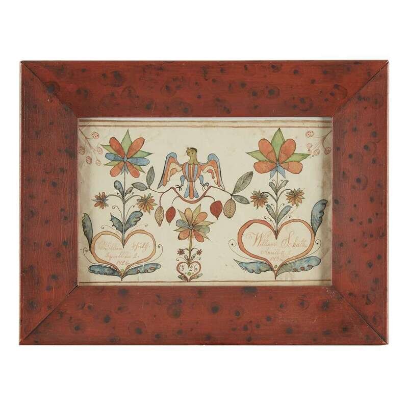The hearts inscribed, "William Schultz April th. 2 1826," the same in German script, dated "1826," watercolor and ink on paper, framed.