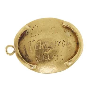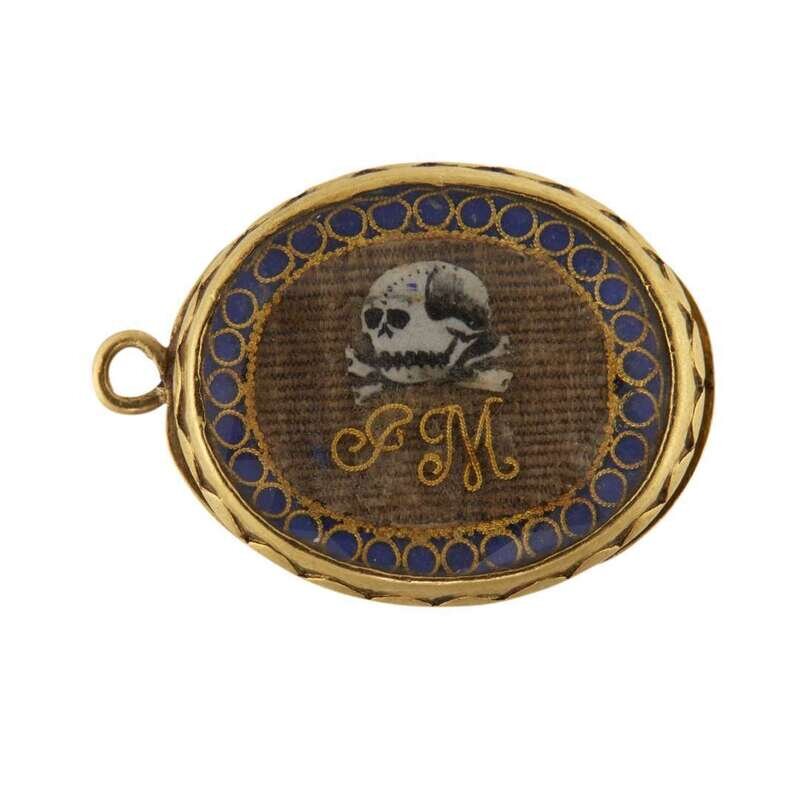 Of oval form, with applied skull and crossbones over gold wire initials, "JM," against hairwork ground with cobalt blue and looping gold wire border, all under faceted crystal, the reverse with loop attachments and inscription, "Obt 12/ May 1704/ aeta 39," seemingly unmarked.