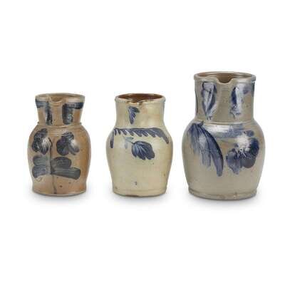 Three small cobalt-decorated stoneware pitchers Mid-Atlantic states, 19th century