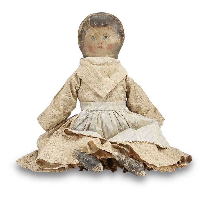 Doll with painted oil cloth face, hands and feet Mid 19th century