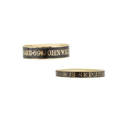 The first, inscribed, "THE RT: HON: LDY: A. C. OB: 12.SEP: 1728. AE: 48," against black enamel ground, seemingly unmarked, in dark brown leather case; the second, with inscription, "JOHN. WILLS. STEPHENS. DIED. 7. FEB: 1821. AGED. 69," against black enamel ground, inside band with hallmarks, including 18k mark and maker's mark: "IB."