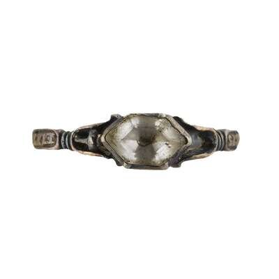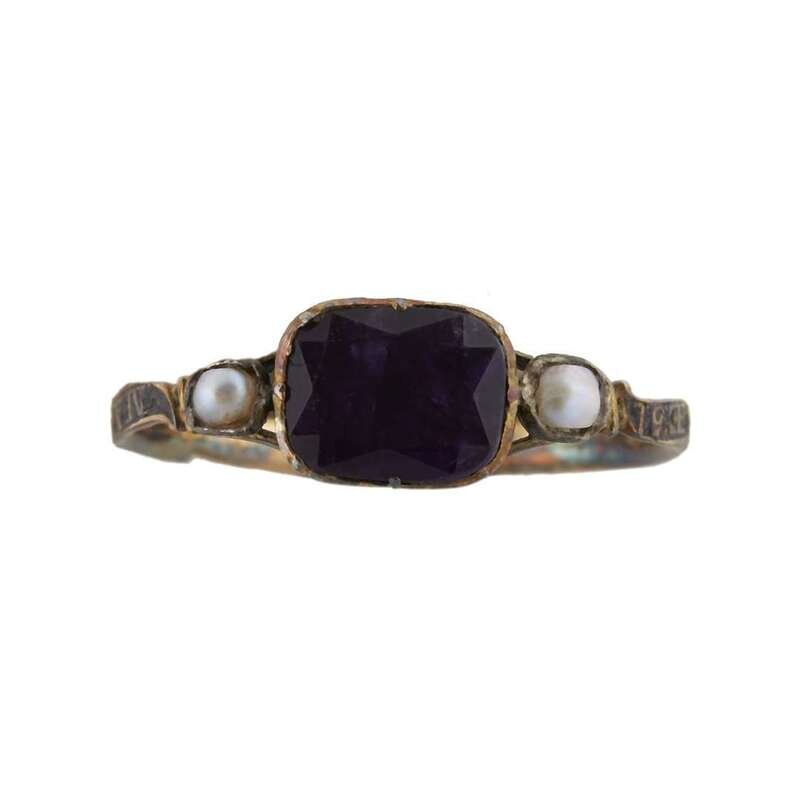 The first, set with faceted crystal, with scrolling band with inscription, "ELIZ. WILFORD OB: 30 SEP: 1729. AE: 73," against worn black enamel ground; the second, set with amethyst and seed pearls, the scrolling band with inscription, "MARTHA. GURNEY. OB: 29. MAY: 1756. AE: 51," against worn black enamel ground, both seemingly unmarked.