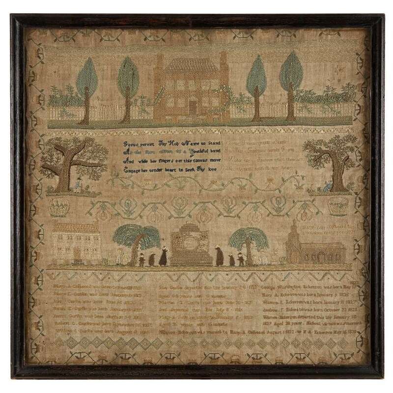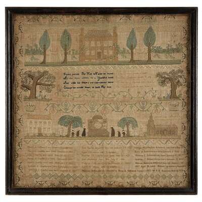 Panel with trees flanking a large house above pious verse and mourning scene, with family register below, worked with silk threads on a linen ground, framed.