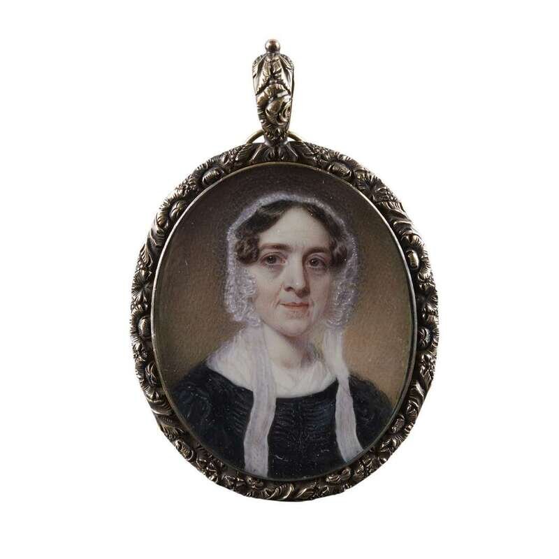 Watercolor on ivory, gilt locket case, woven hair inset on verso.