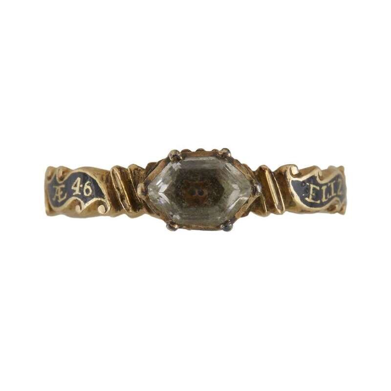 Set with lozenge-shaped crystal above skull, the scrolling band with inscription, "ELIZ: FORESTER OB 26 MAR 1753 AE 46," against black enamel ground, seemingly unmarked.