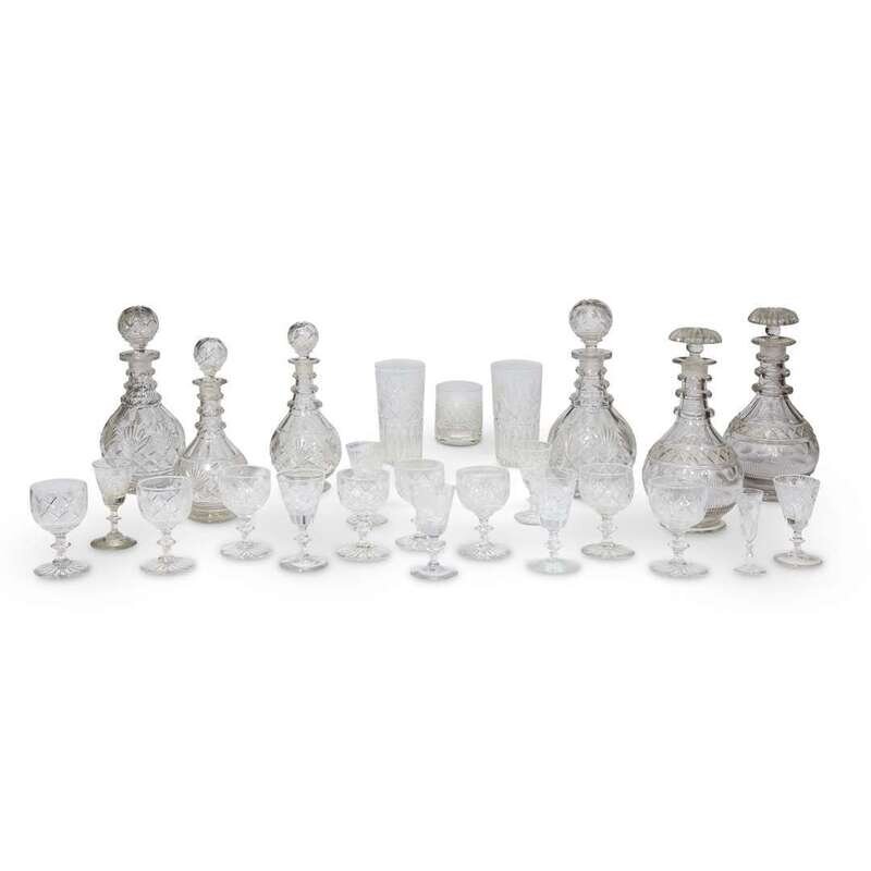 Comprising three pairs of decanters, two tall glasses, one tumbler, eight goblet style glasses, seven wine glasses, and one sherry glass, all cut with strawberry, diamond and fan patterns.