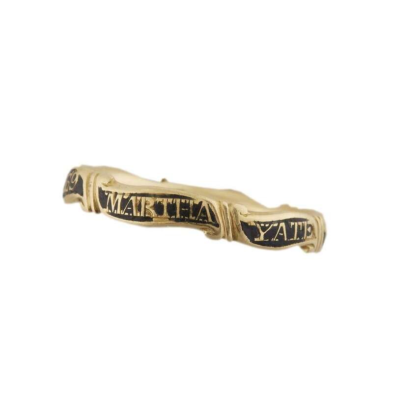 Both with shaped bands; the first, with inscription, "MARTHA YATE OB: 28 APR: 1760 AE: 69," against black enamel ground, maker's mark to inner band, "JJ"; the second, with inscription, "WALTER DOVEY AR OB: 13 FEB. 1761 AE: 56," against white enamel ground, maker's mark to inner band, "WI."