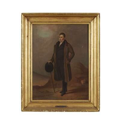 Oil on panel, framed, frame retains plaque misattributing the portrait to Samuel F. B. Morse (1791-1872); the panel verso with sketch for battle scene painting.