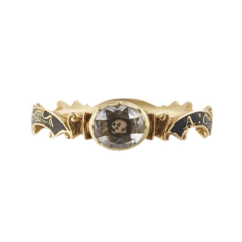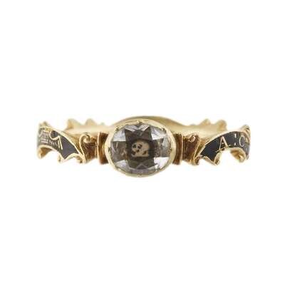 Set with faceted glass stone over skull, the scrolling band with inscription, "A:C: OB: 11 NOV: 1753," on black enamel ground, seemingly unmarked.