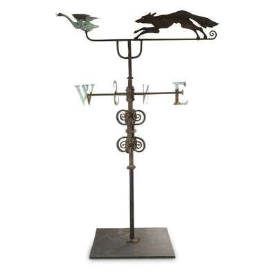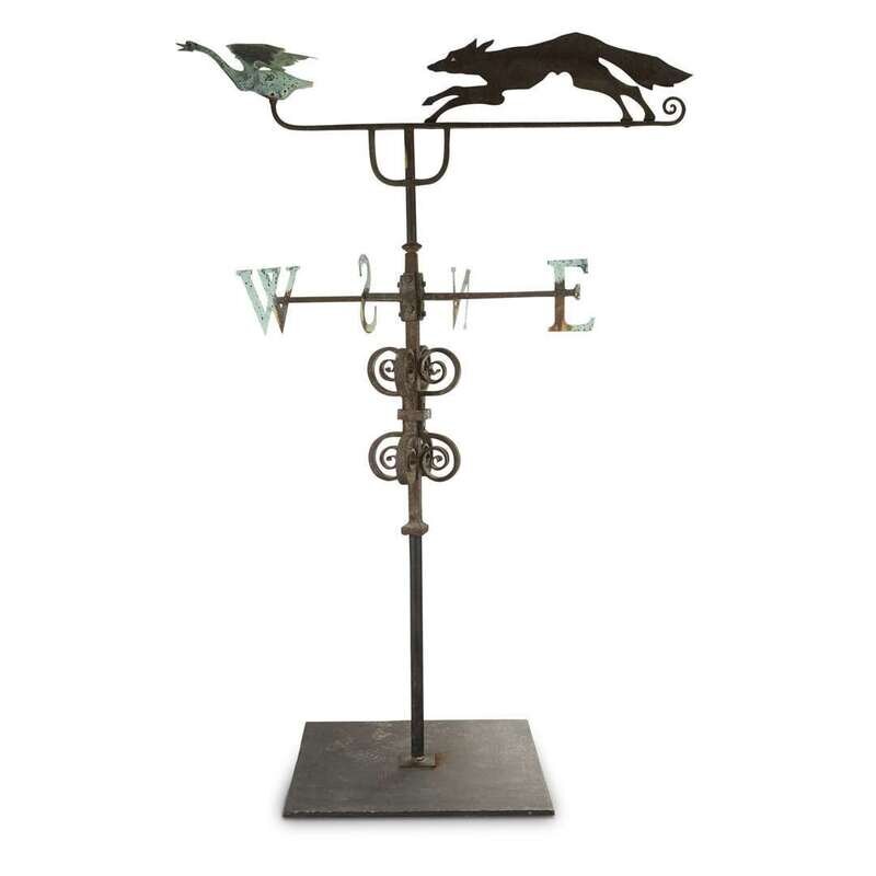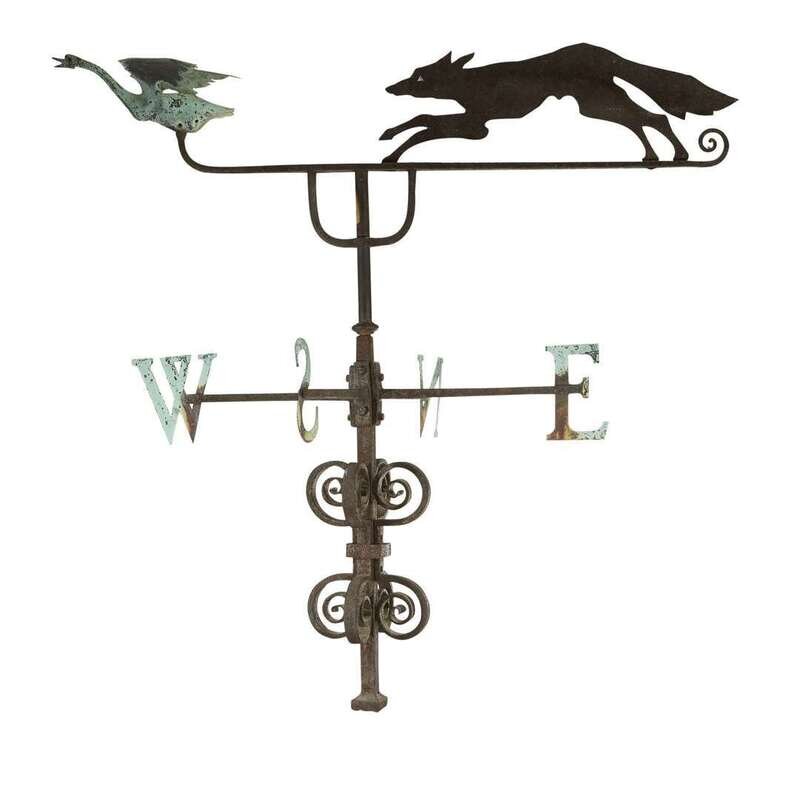 Three dimensional goose with verdigris surface and silhouetted fox raised on scrolled post with original copper directionals.