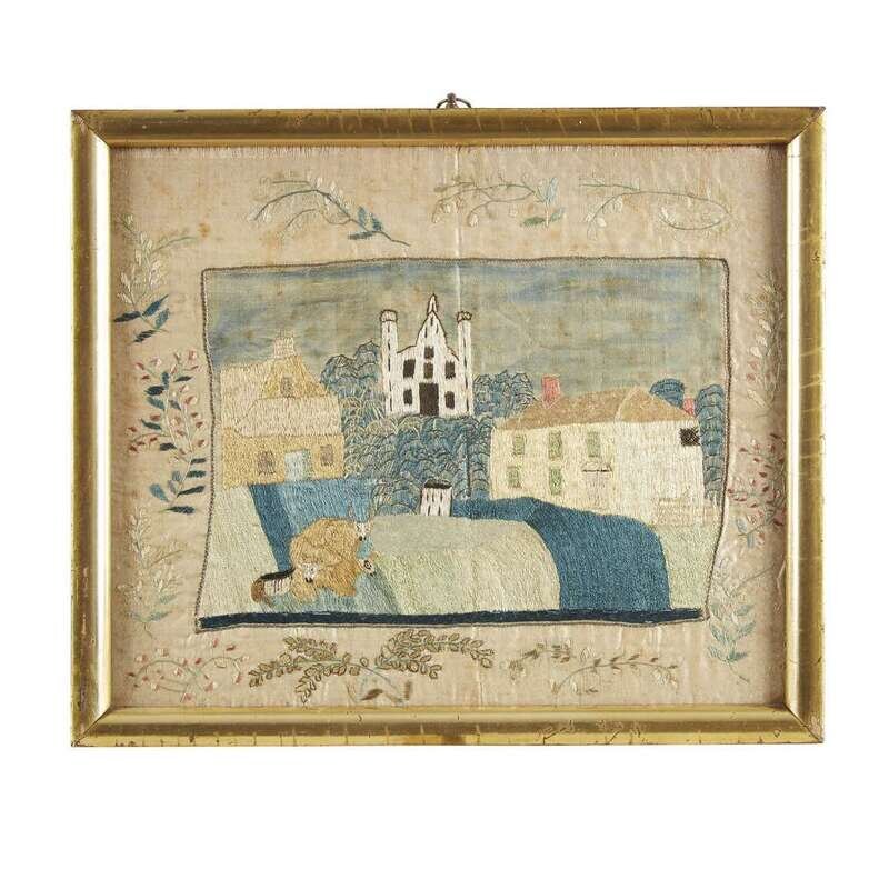 Worked with polychrome silk and metallic threads and watercolor on a silk ground, framed.