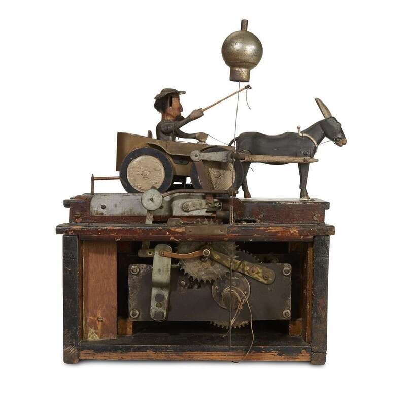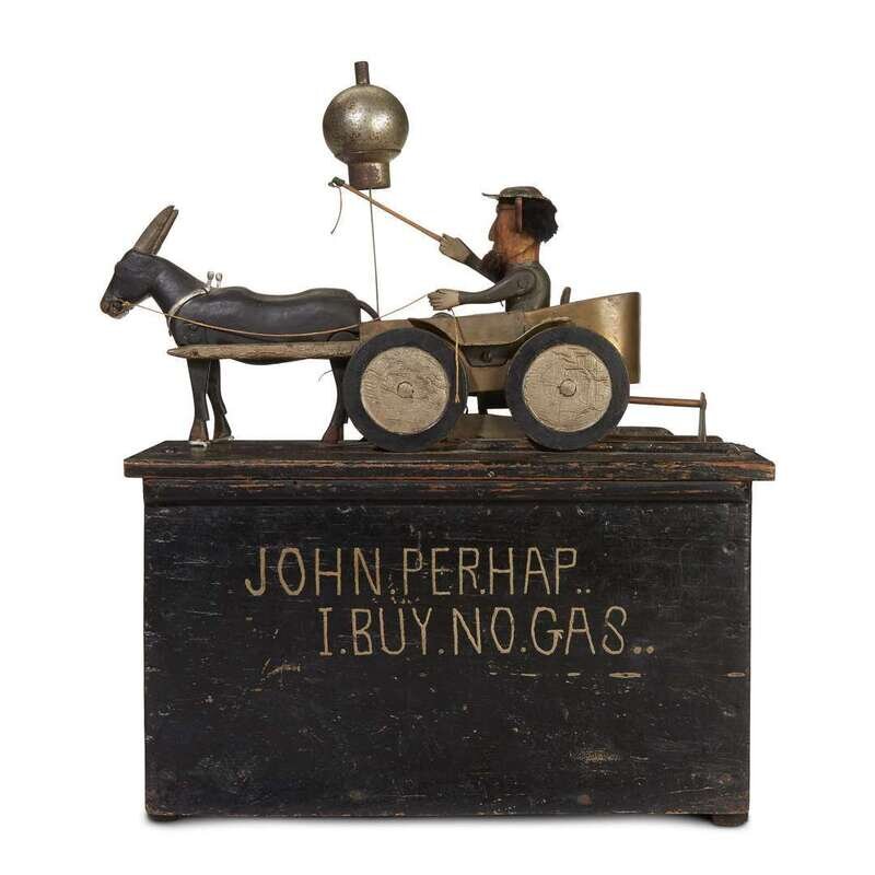 An articulated mule pulling a wagon, with articulated rider holding a lunging stick, with painted inscription to side, "John. Perhap../I. Buy. No. Gas."