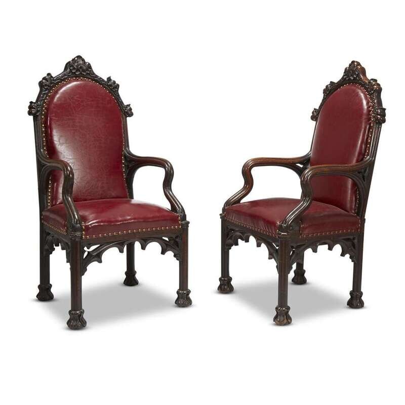 Two Herrick-Maynard-Hatch Gothic Revival carved oak armchairs Designed by Alexander Jackson Davis (1803-1892), New York, made by Bur