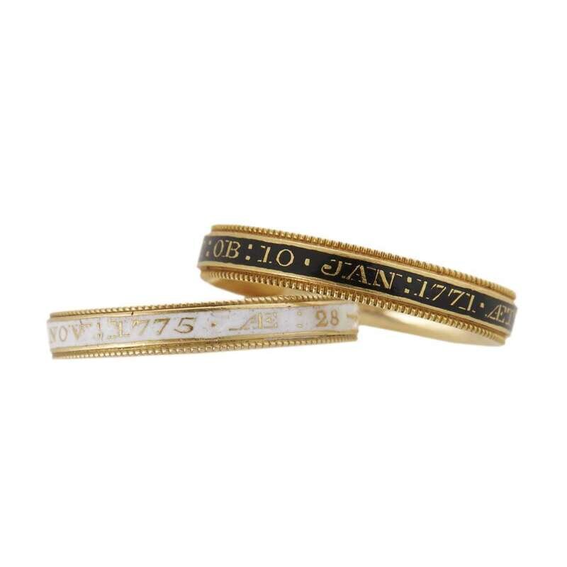 Two gold and enamel mourning band rings Probably England, dated 1771 and 1775