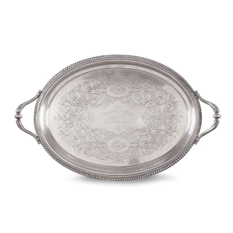 Oval, with engraved rococo designs, flowers, and diaper-work, bearing an inscription to center,"To The Centennial Treasurer of the City of Philadelphia 1876."