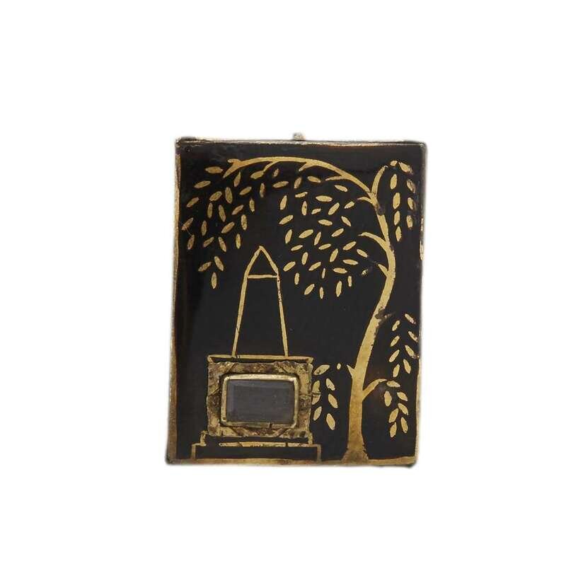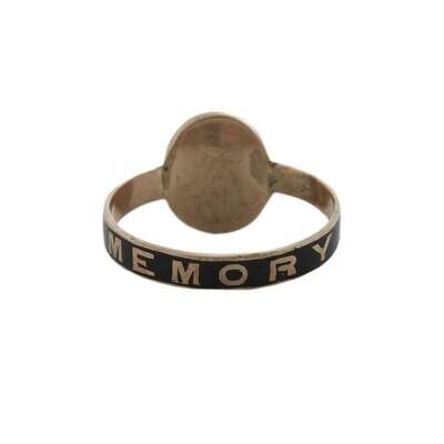 Of square form, depicting weeping willow tree above obelisk on plinth set with crystal; together with a garnet and enameled gold ring, the band with inscription, "IN MEMORY OF," seemingly unmarked.