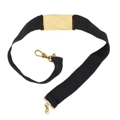 With inscription, "IN. MEMORY. OF," against black enamel ground, further inscribed along inner band, "James Kea(r)y Jany 8th 1845 AEt 55," alongside set of hallmarks, including 18K purity mark and maker's mark, "S.S"; together with a black grosgrain ribbon choker with embellished gold slide and gold hook & clasp.