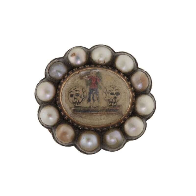 Of oval form, with trumpeting angel flanked by two skulls, against hairwork ground, all under faceted rock crystal with seed pearl surround, the polychrome enameled reverse with loop attachments, seemingly unmarked.