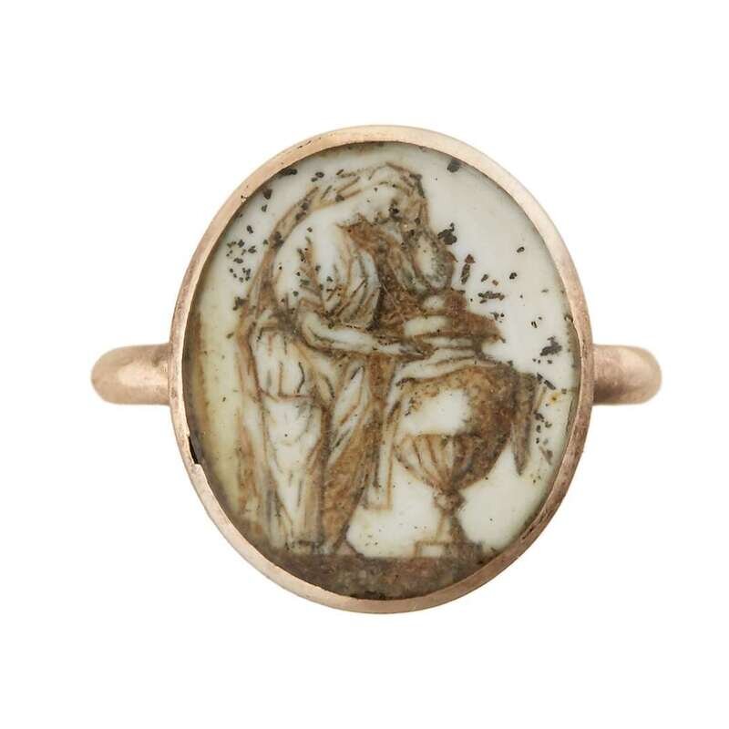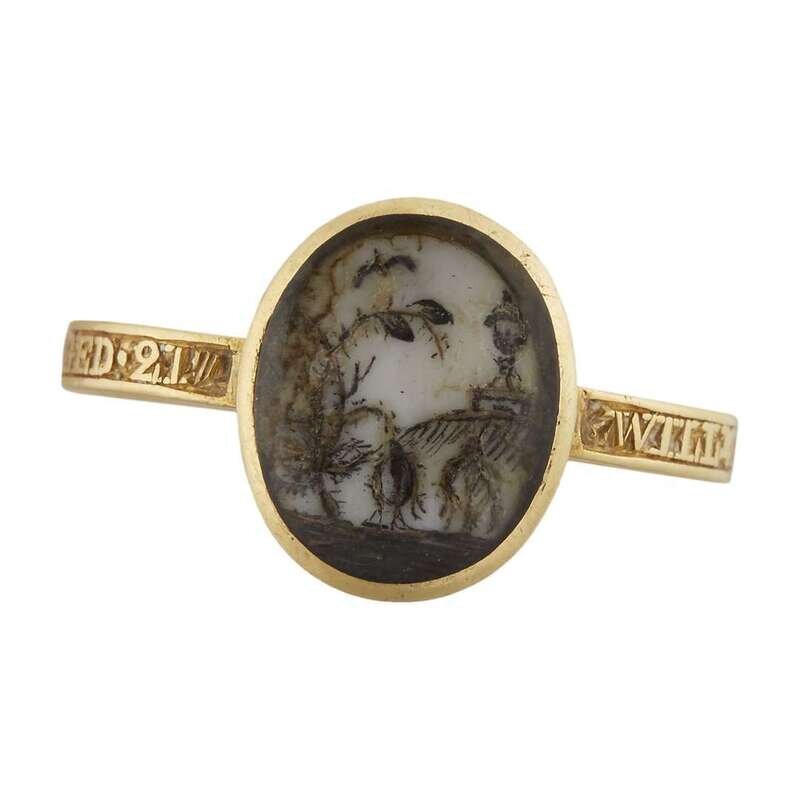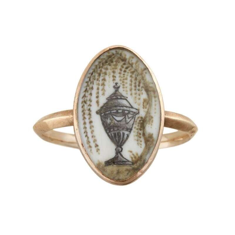 The first, of circular form, painted with woman leaning on covered urn, the reverse set with hair and inscribed, "Mary Paine/ ob: 1 Apr./ 1773 AE 25"; the second, of oval form, with drooping rosebuds and urn on hill in the distance, the band inscribed, "WILLM PIDDOCK DIED 28 APR 1774 AGED 21," further inscribed along inner band, "IN Piddock died 5 Jany 1773 Aged 28," fitted in jeweler's box; the third, of oval form, depicting covered urn beneath weeping willow tree, the reverse inscribed, "Sarah/ Baldrey/ ob. 3/ Jan. 1780/ Aet 64," all seemingly unmarked.